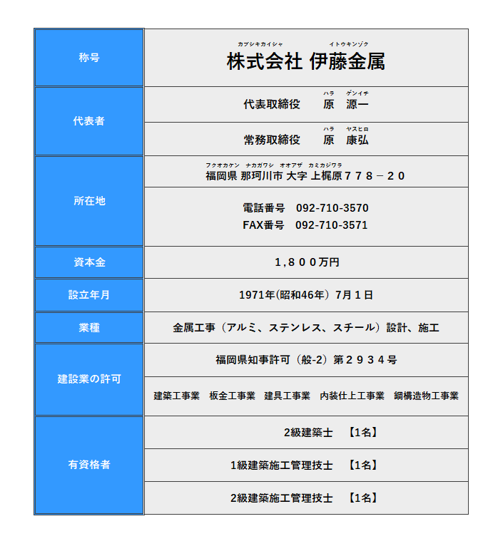 会社概要 アクセス方法につきましては、『アクセス』ページ、または 『ご案内(お車でお越しの方)』のページをご確認ください。 株式会社伊藤金属 事務所那珂川市 敷地内の工場那珂川市 主要取引先 ■ 銀 行 アクセス 〒811-1223 福岡県 那珂川市 大字 上梶原778−20 Google Map Googleマップでお調べされる場合、出発地をご入力ください。 アクセス方法につきましては、 別ページの『アクセス』または『ご案内(お車でお越しの方)』も ご一緒にご確認ください。