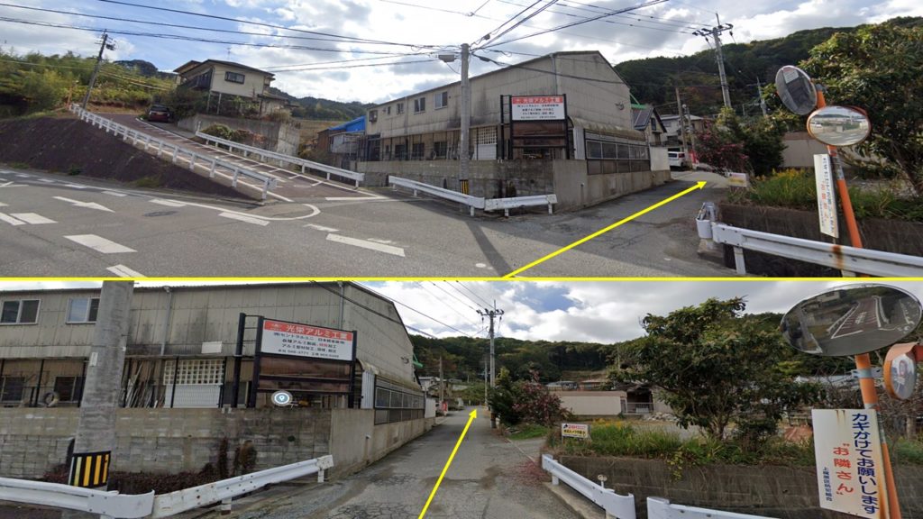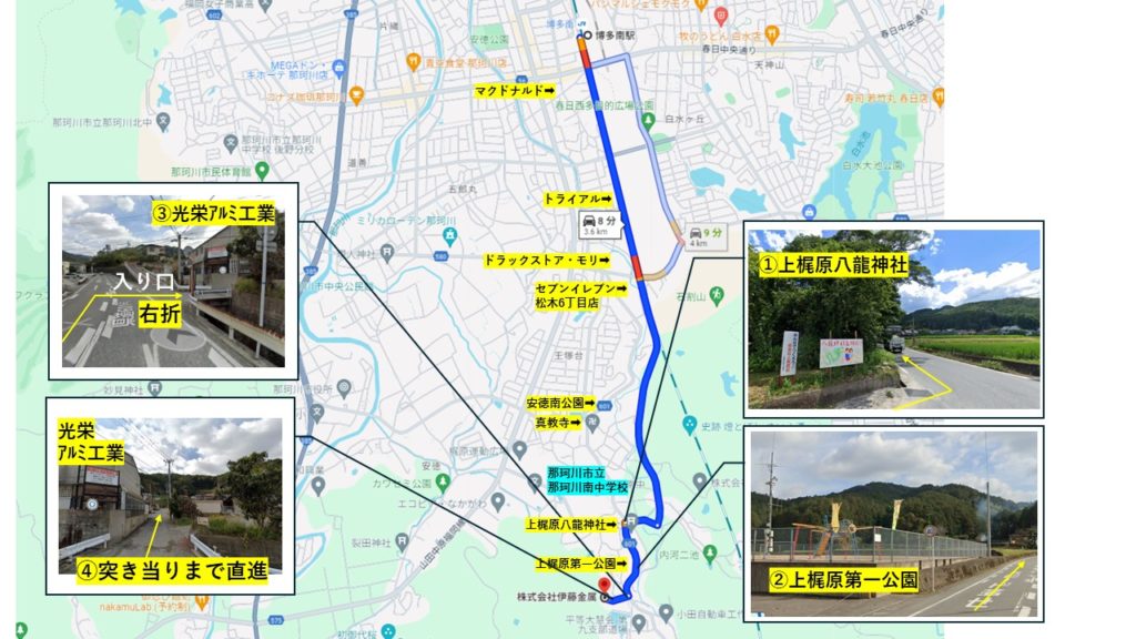 ■③八龍神社を左折→④(有)光栄アルミ工業の看板が見えたら右折→坂の1本道の1番奥(右側)の家が弊社です。